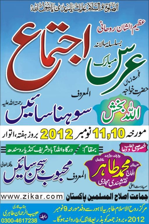 Urs Shareef Special Session Will Begin At 08:00 A.m Sunday Morning And Specifically Addressing By Pir Khuwaja Mohammad Tahir Abbasi Naqshbandi Known Mehboob Sajan Sain (Damat Bar katam hul Aliya)